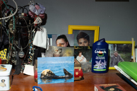 C’est l’ennui, on erre dans la maison de mon enfance. Ma mère, ma soeur, le chien et moi. Il fait sombre alors je sors mon flash. Ma mère fait ses comptes, c’est important les comptes. Ma soeur s’ennuie, alors elle trouve refuge sur le canapé. L’après midi n’est pas frivole, mais c’est une part du quotidien, alors on s’ennuie ensemble, on trouve des occupations, on regarde les veilles photos de nous dans la chambre parentale. Savant mélange de photos de classes à l’esthétique vieillotte, une photo de mon grand-père qui sourit, un shampoing Ushuaia, une photo de notre mamie avec un bébé qu’on ne saurait pas identifier. Et puis ces hortensias qu’on a toujours vues, en été elles sont en fleur, en hiver elles ne ressemblent à rien, mais ma mère les aime. Une maison familiale, ce sont des choses qui bougent des souvenirs qui s’effacent, d’autres qui se créent, certains dans l’ennui d’ailleurs.